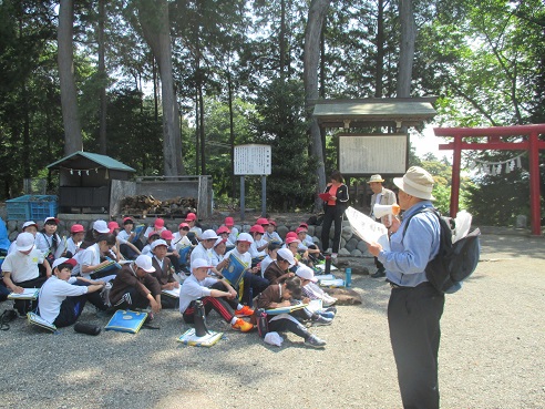 2017年5月15日 09時20分先週の金曜日(5/12)、6年生は、久津部一里塚・松並木はもちろんのこと、石ノ形宇佐八幡境内古墳群、富士浅間宮、上嶽寺、花茣蓙公園などを巡り、地元に残る貴重な歴史遺産を学んできました。一緒に案内しながら、説明等をしてくださっているのは、郷土資料館の鈴木さんと岩本さんです。