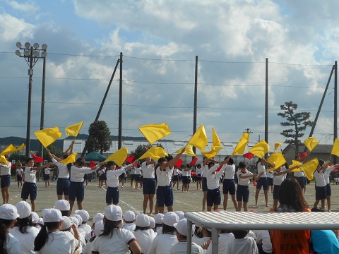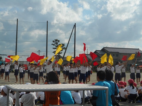 ユーカリ森の大運動会➁ 2017年11月1日 13時50分 10/28(土)は悪天候により実施できなかった運動会を、昨日(10/31)行いました。午後の最初の種目は、応援合戦です。 続きを読む 先攻は白組です。高校野球の応援なども取り入れた、一つにまとまった応援でした。続いて後攻の赤組。こちらも息の合った応援ぶり、素晴らしかったです。応援合戦に続いて低学年部の学年種目、玉入れを行いました。雨続きで本物を使った練習は一度もできませんでしたが・・・やっぱりなかなか入りません。1年・2年、1・2年と3本勝負を行い、結果は赤組の勝ちでした。中学年部の学年種目はデカパンリレーです。結果は白組の圧勝でした。そしていよいよ運動会の華、高学年の表現種目「結」です。最初のパートは2色のフラッグを使ったマスゲーム部分です。続いてダンスパート部分・・・最後に組み体操部分へと移行していきました。今年はこれら一連の演技を、笛による合図を入れず、全て音楽に合わせて進行していきました。最後に指導してくれた先生方へ感謝の言葉を伝えるセレモニー・・・これは職員にとってもサプライズの演出で、感動のうちに演技が終了しました。フィナーレを飾る最後の種目は、グランプリリレーです。低学年の部(1~3年生)は、赤組と白組が同点でした。アンカーへのバトンパスです。結局赤組が1・2位を獲得しました。さあ、閉会式・・・結果の発表・・・(得点集計表)今年は赤組が勝ちました。赤組応援団長に優勝旗を・・・白組応援団長に準優勝トロフィーを手渡しました。感想発表は、5年生代表の村松蒼海くんです。応援してくださった地域・保護者の皆様、本当にありがとうございました。 閉じる